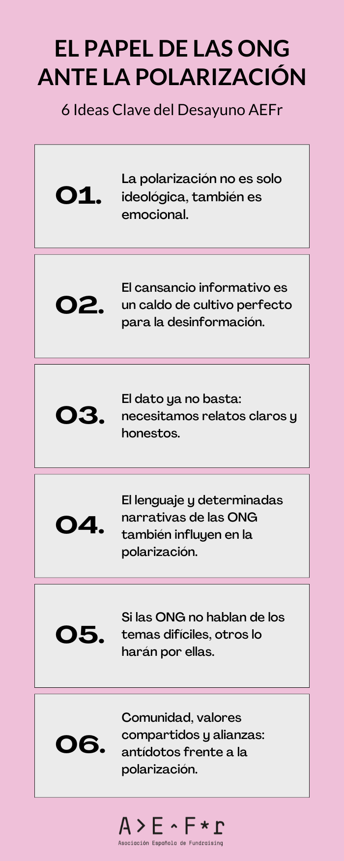 Es precisamente en este cruce de caminos donde se sitúa nuestro último Desayuno AEFr, «El papel de las ONG ante la polarización», que organizamos en Madrid y Barcelona en exclusiva para nuestros asociados. A partir de la investigación de More in Common y de las experiencias que compartieron organizaciones como Cáritas, porCausa, Amnistía Internacional y Oxfam Intermón, nos propusimos explorar qué papel puede jugar el tercer sector en un clima de división creciente y qué cambios internos necesita para no alimentar esa dinámica.